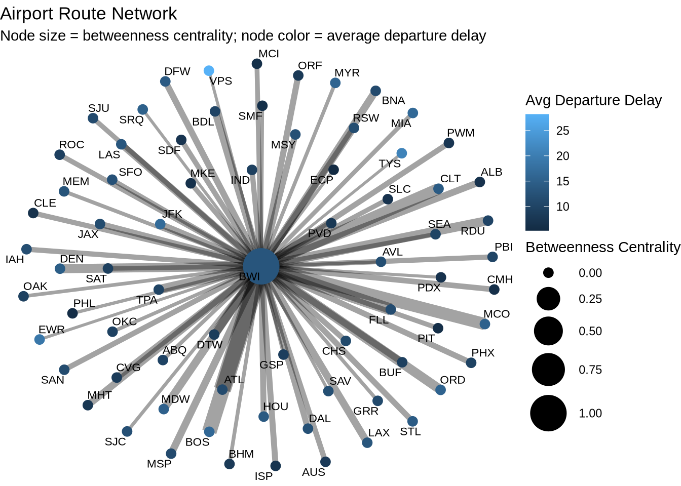 subtitle = "Node size = betweenness centrality; node color = average departure delay",