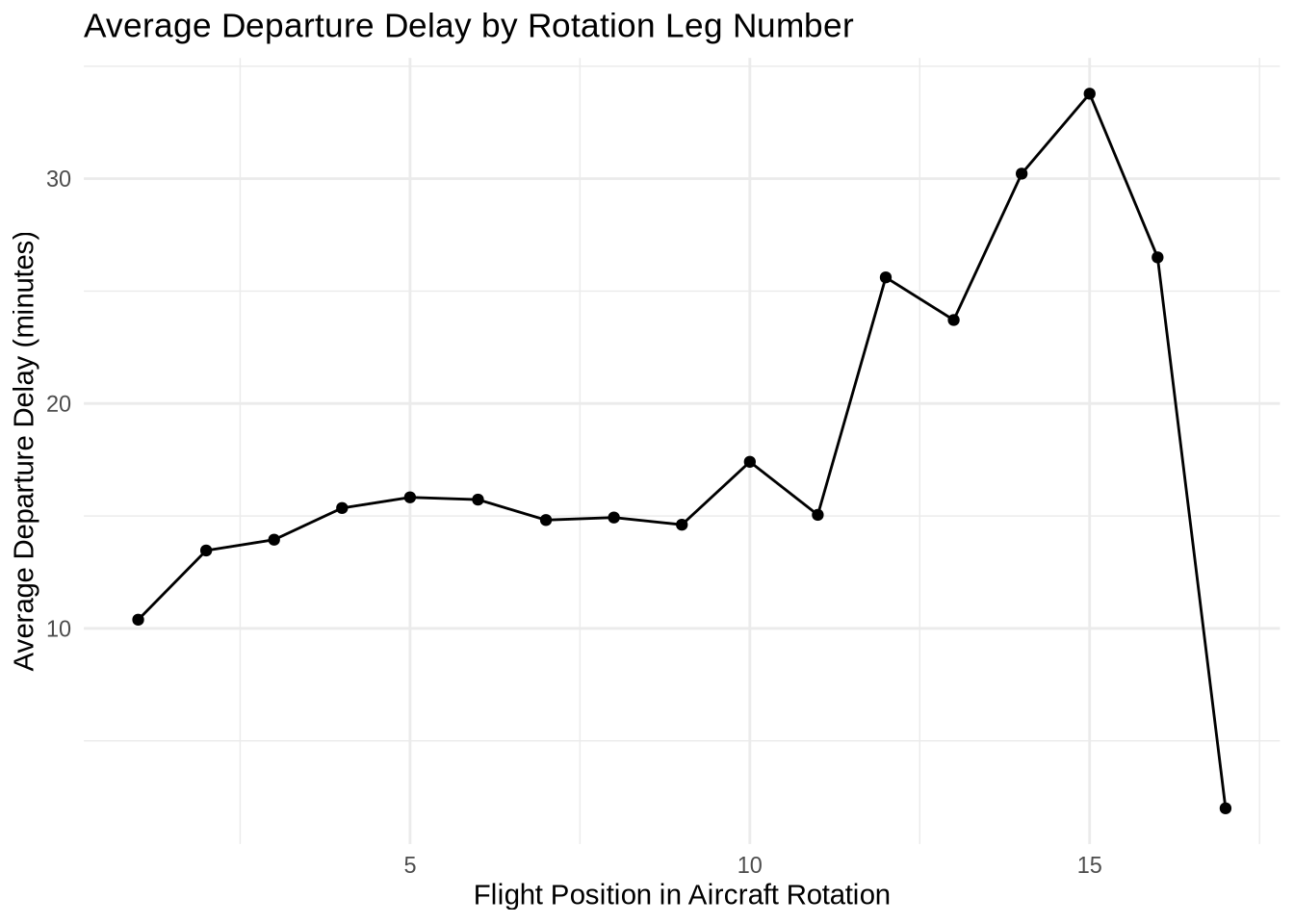 title = "Average Departure Delay by Rotation Leg Number",