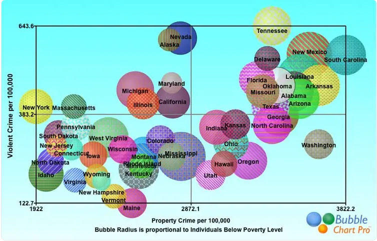 - The bubble radius for the poverty variable has no numeric reference, so even though they are comparable between states, any single radius has no meaning on its own.