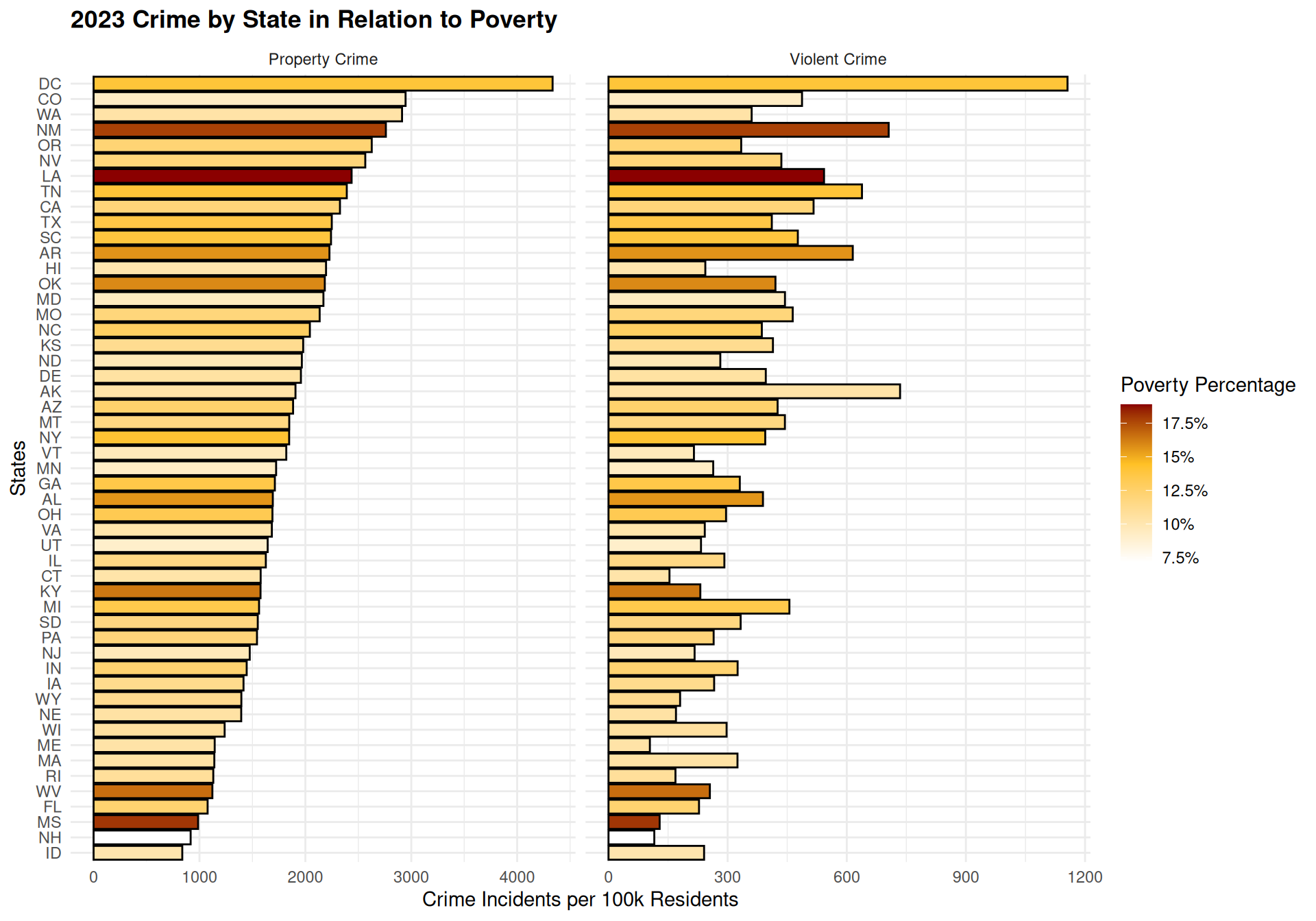 When comparing the two bar charts, the previously identified positive trend between property crime and violent crime is shown, although it is not exactly linear. Upon examining the visualization more closely, it is interesting that Mississippi exhibits relatively low property crime and violent crime given its high poverty percentage. Conversely, it is interesting that Colorado has such a low poverty percentage given that it exhibits higher property crime and violent crime. This could indicate the lack of a substantial relationship between poverty percentage and crime incidents (property crime and violent crime) at the state level.