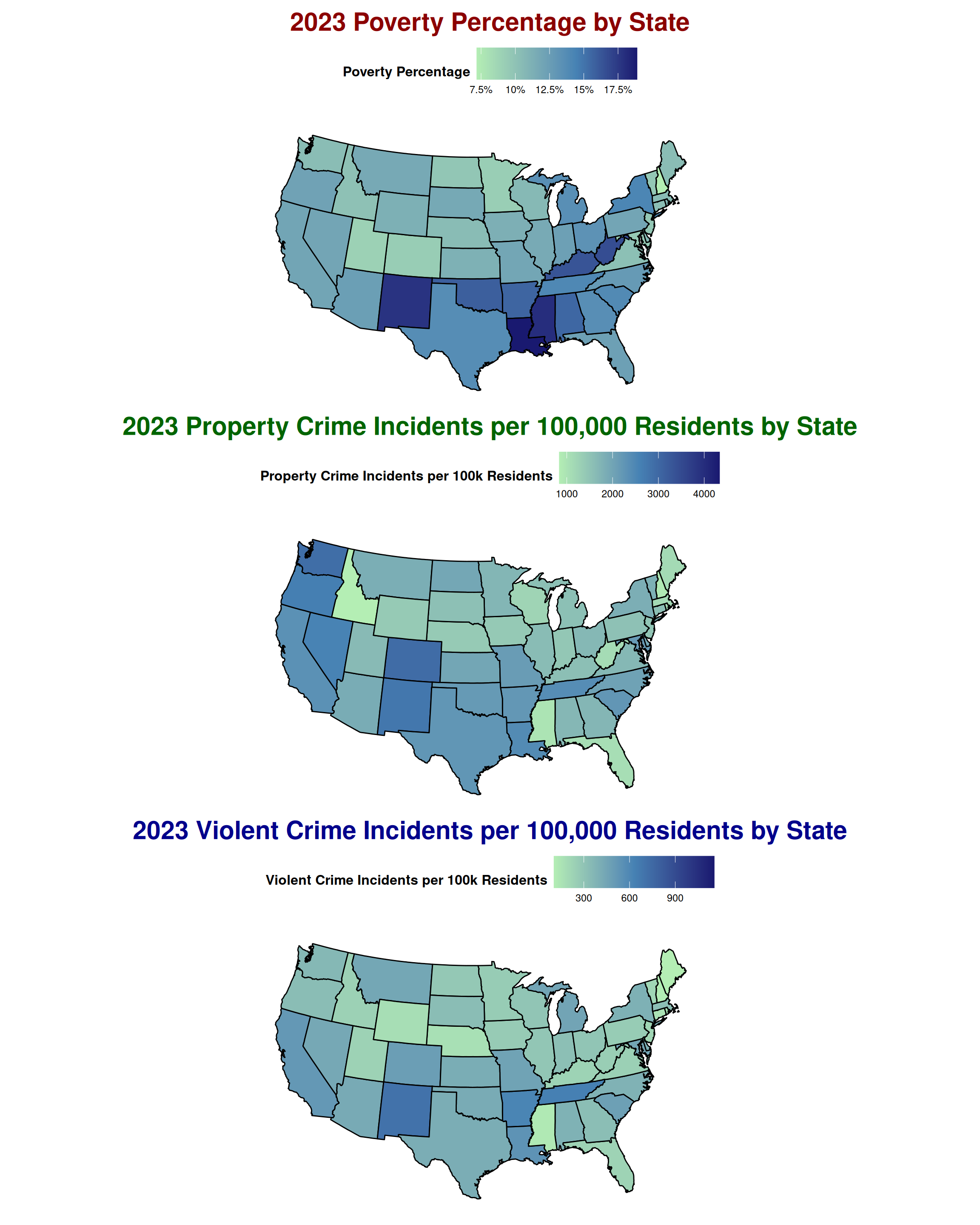 There are a few regions in the US that exhibit a relatively darker hue on all three maps. These regions include the southern Midwest states, states in the mid-southern West Coast area, and a few states in the mid-southern East Coast area. However, analyzing broader state data may not be the most effective route to capture more comprehensive trends. To better understand the relationship between poverty and crime in the US, the next step is to examine data at the county level, allowing for more detailed and comprehensive analysis.